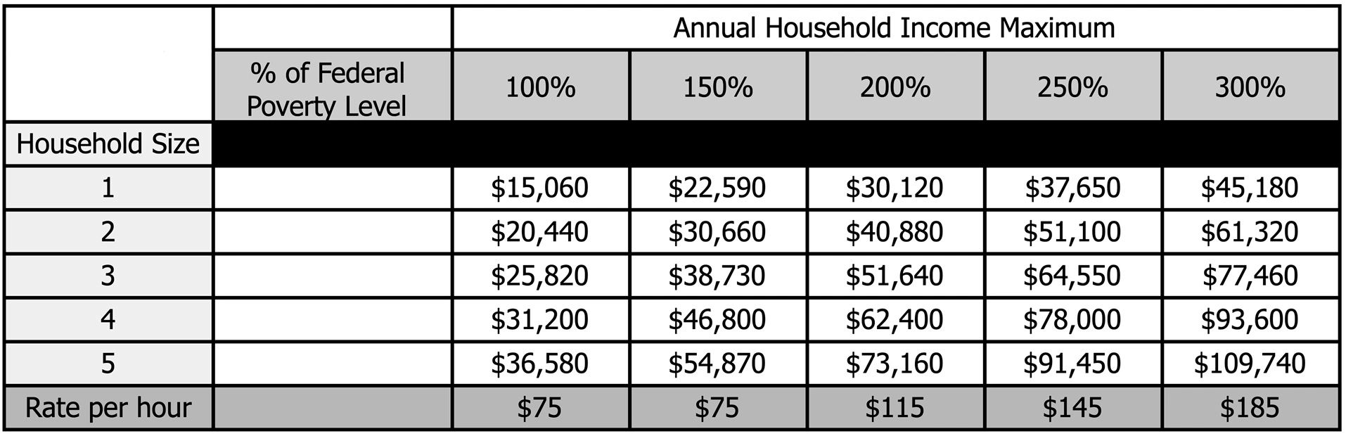 We do charge fees for most estate planning and elder law services. Fees are determined on a sliding scale basis. Your rate is based on the chart above.